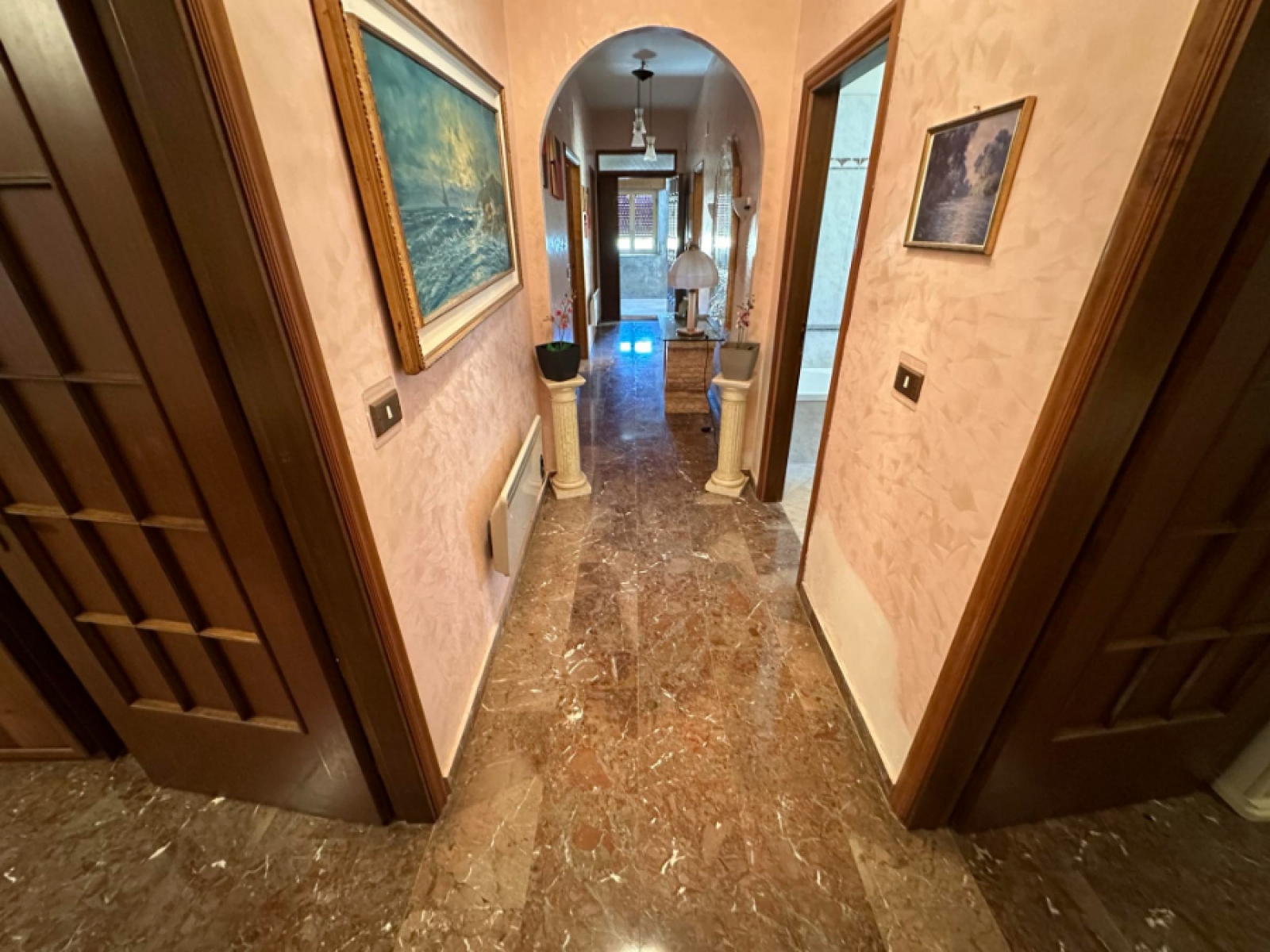 Ingresso, cucina, soggiorno, tre camere da letto, doppi servizi, ripostiglio e balconi.