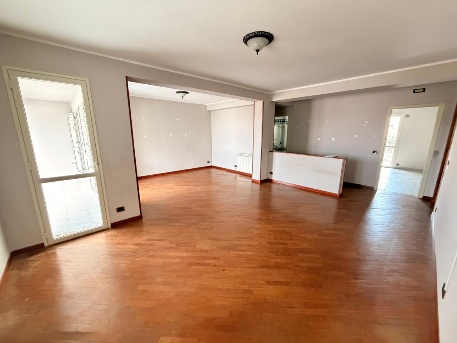 L’immobile si apre su un ampio soggiorno molto luminoso, con finestra e più accessi a un grande balcone/veranda.