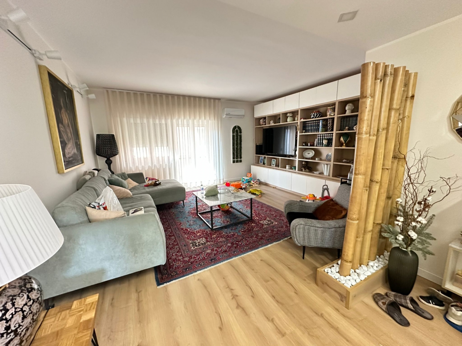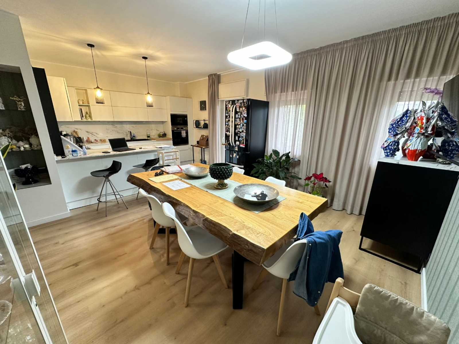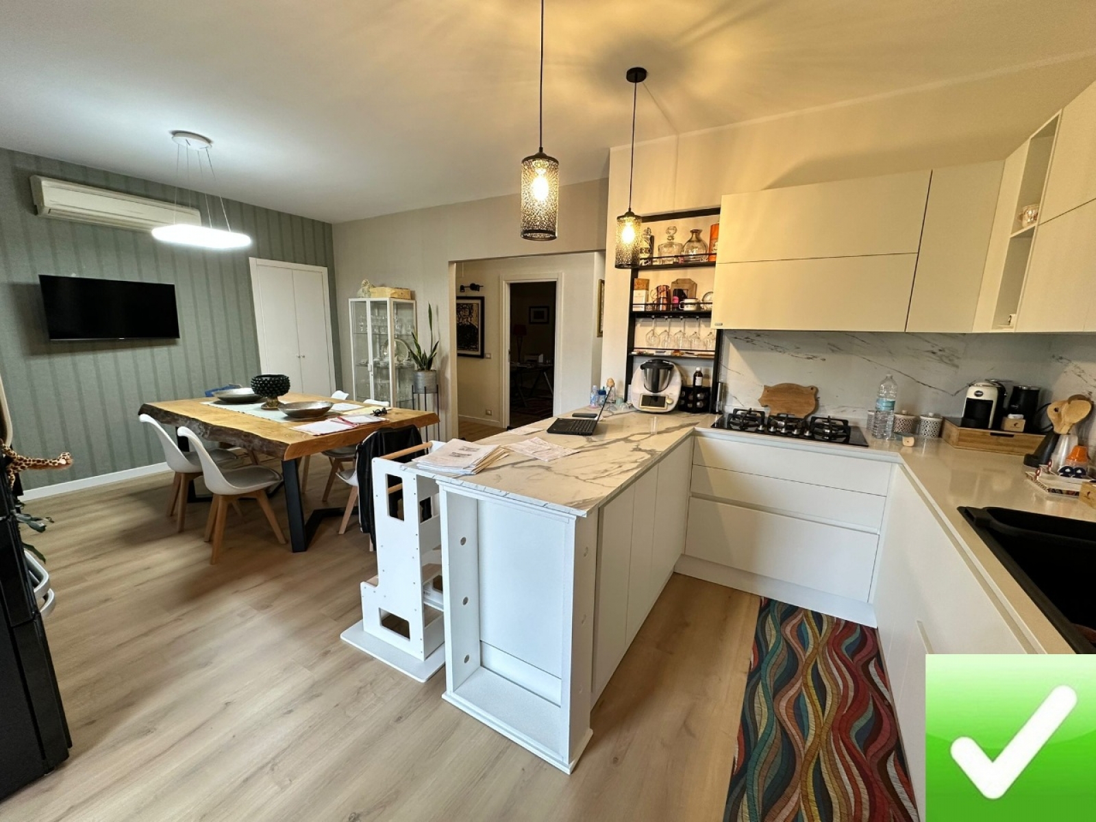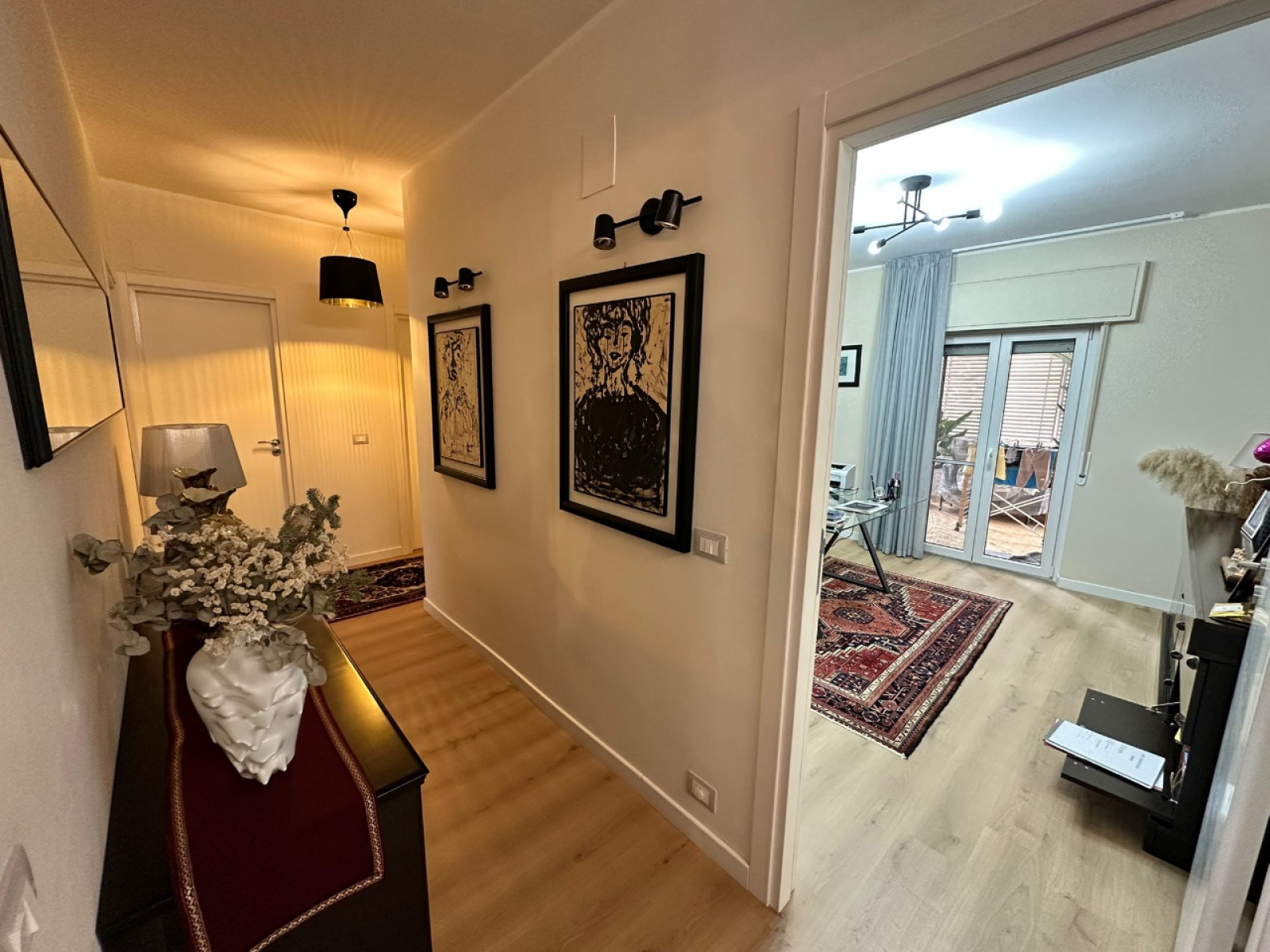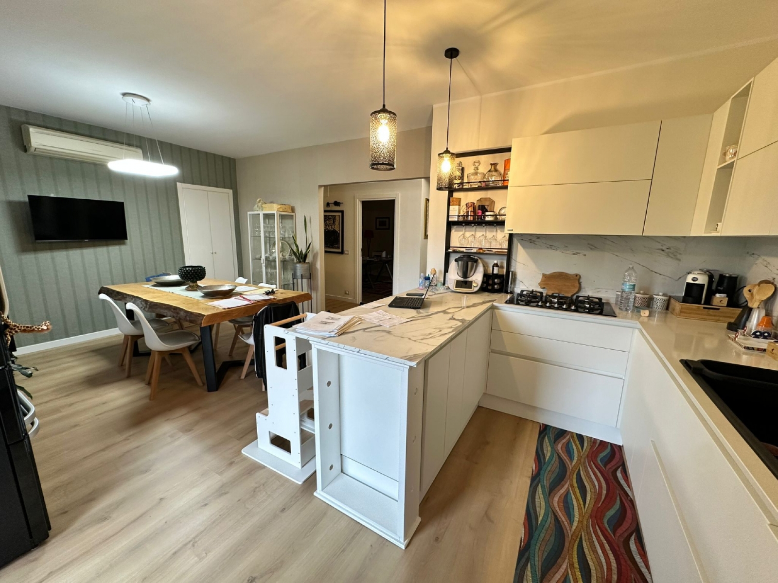 L’ingresso conduce in un ampio e luminoso soggiorno, con accesso diretto alla veranda, perfetta come zona relax o spazio conviviale da vivere tutto l’anno. La cucina abitabile, dotata di comoda dispensa, affaccia sul balcone e si presta perfettamente alla vita quotidiana di una famiglia.