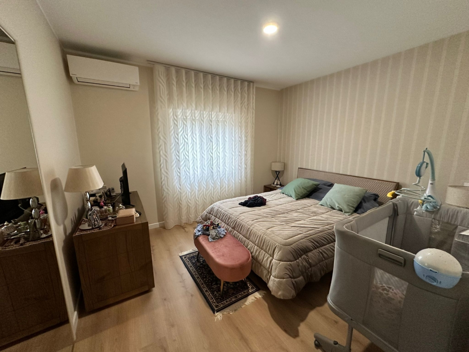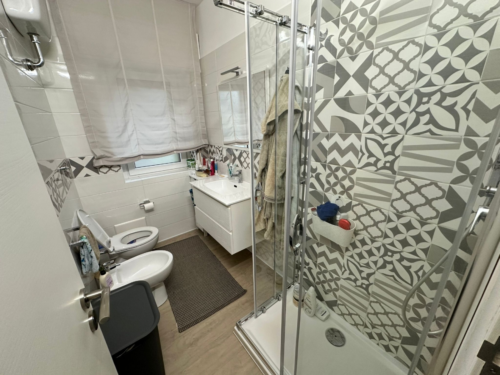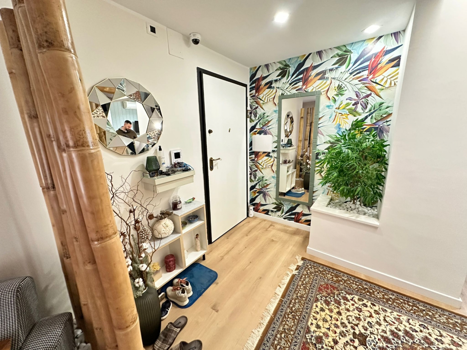 L’appartamento è rifinito con materiali di qualità ed è dotato di climatizzatori, infissi a doppio vetro, zanzariere, tende automatiche, portone blindato, videocitofono e impianto di allarme. A servizio dell’immobile sono presenti posto auto coperto e cantina.