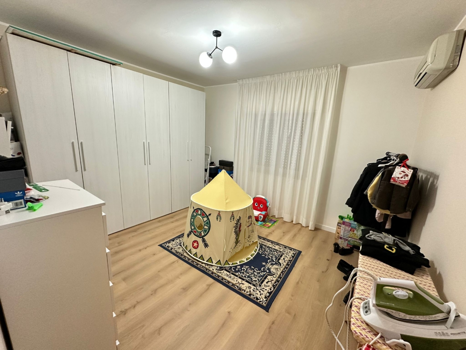 La zona notte è composta da tre camere da letto, di cui una matrimoniale con cabina armadio, e da due bagni moderni. Completa la distribuzione una pratica zona lavanderia esterna.